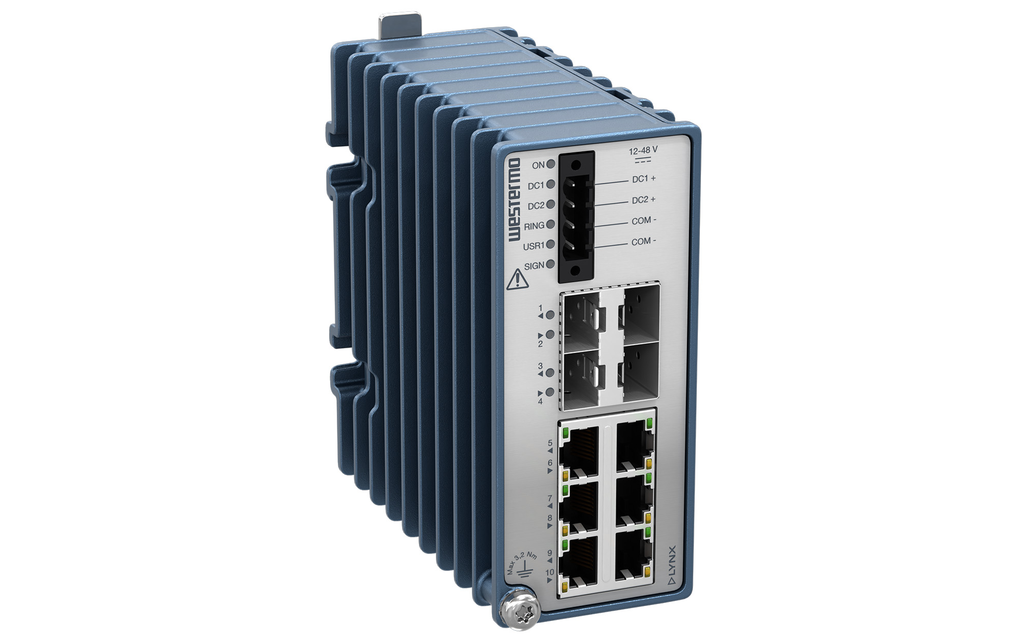 Industrial Layer 3 Gigabit Switch6 x RJ-45, 10/100/1000BaseT(X)4 x 1 Gbit/s, Fiber SFP ports12 to 48 VDC-40 to +70°C