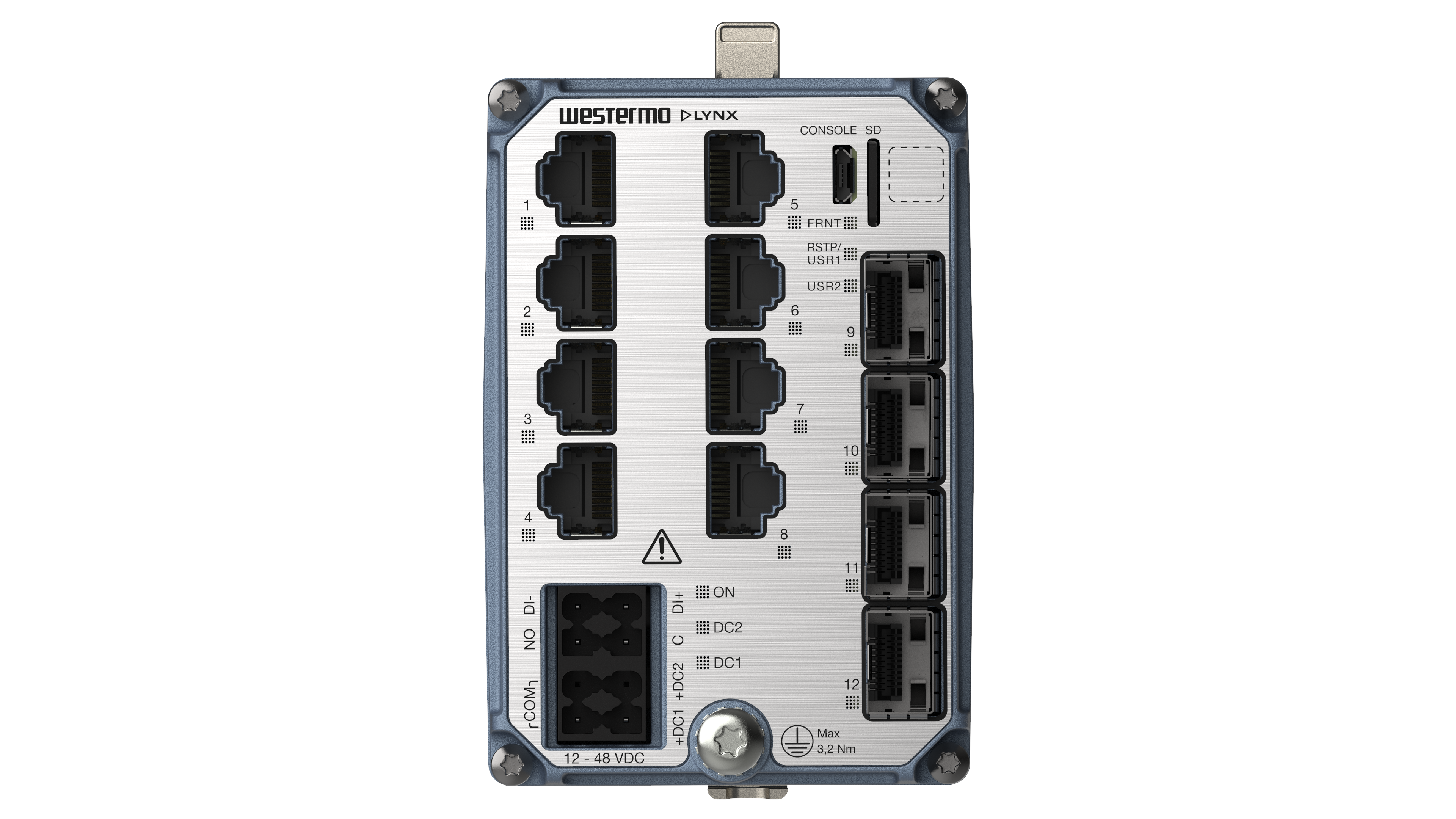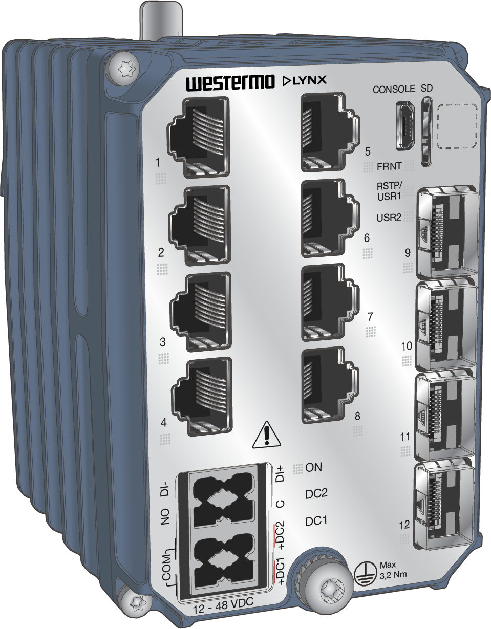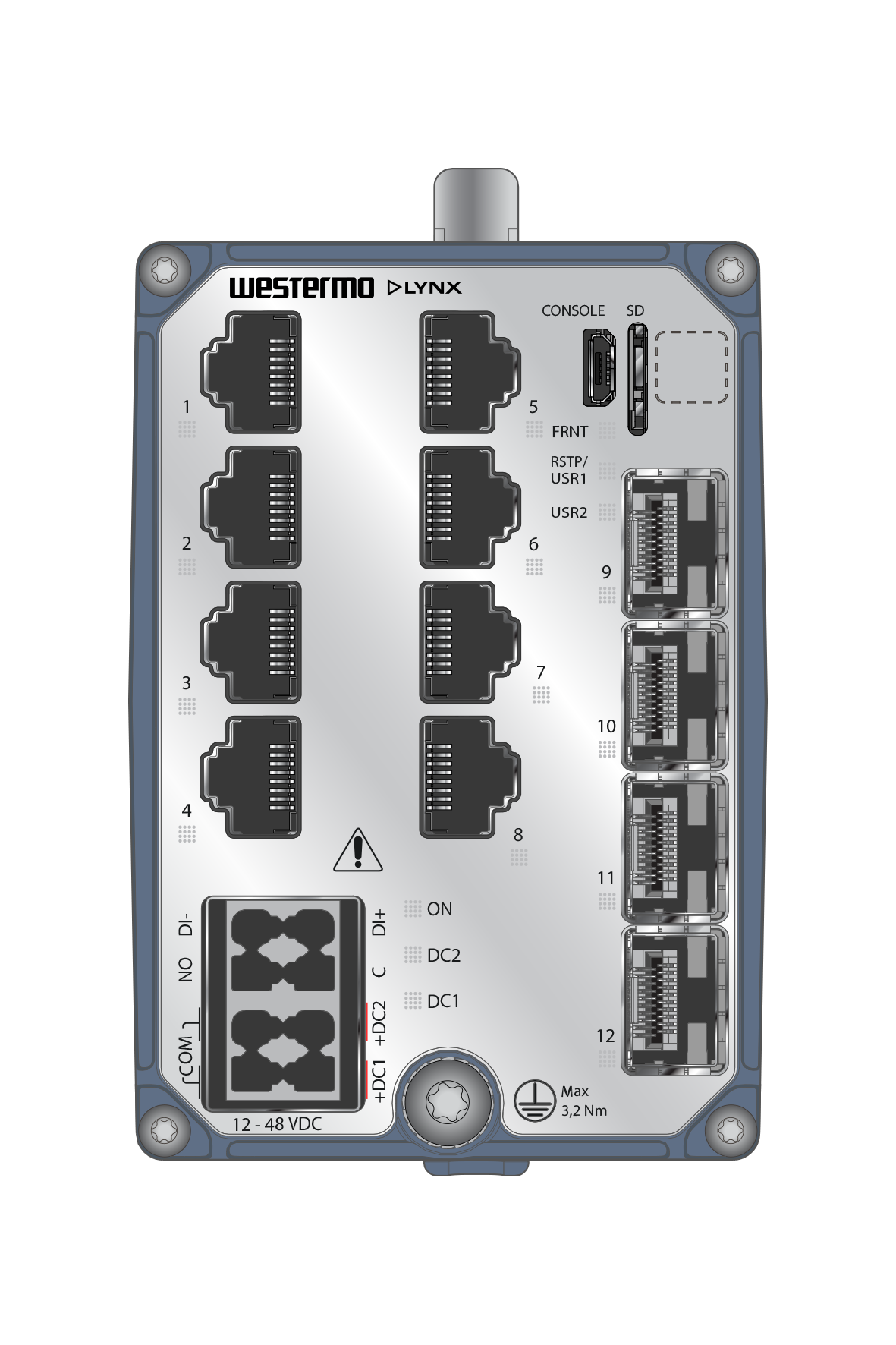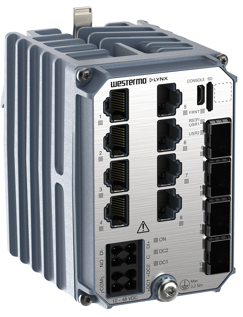 Westermo Substation Automation Switch Lynx 5612 left front view.