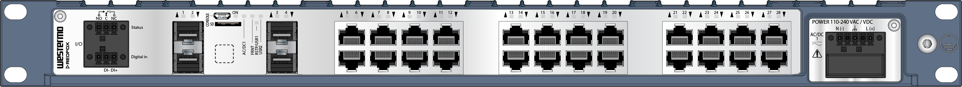 19" Managed Substation Automation Switch - High voltage version, layer 3110 to 240 V AC/DC4 x 100/1000 Mbit/s SFP transceivers supported, Ethernet FX (LC)24 x 10/100/1000 Mbit/s, Ethernet TX, RJ-45