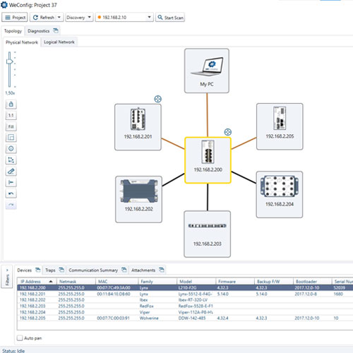 WeConfig v2 simplifie la découverte, la configuration et la maintenance des réseaux industriels en automatisant les tâches clés, ce qui réduit considérablement les efforts manuels. À mesure que les réseaux s'étendent, il s'adapte sans difficulté à des centaines de commutateurs et de routeurs.