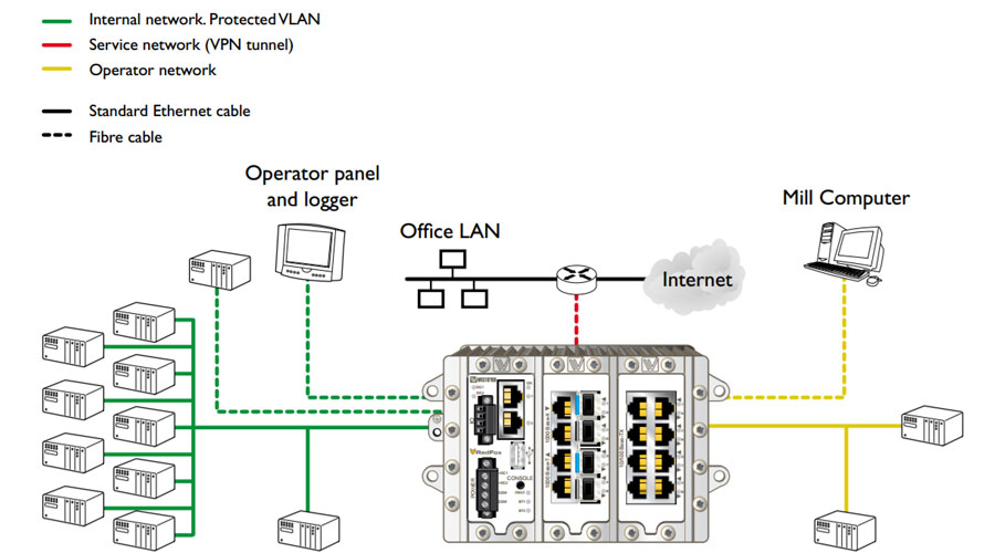The RedFox Industrial’s WeOS operating system enables the communication network to be subdivided into three Virtual VLANs: A protected VLAN, using an encrypted VPN tunnel that is not accessible by the client, connects all the measuring and control instruments. A second VLAN connects to the rolling mill control computer and the third connects to the mill's office network. This provides a link to the Internet and enables the system to be monitored securely from outside the industrial network.