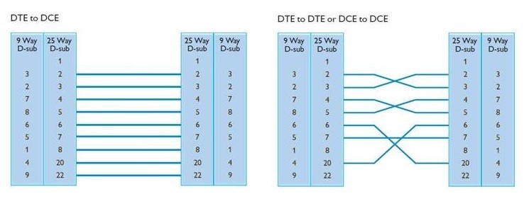 The major problem most users would have was knowing whether the port on their equipment was configured as DTE (Data Terminal Equipment) or DCE (Data Communication Equipment). Broadly speaking most PCs and data terminals were DTE and modems or communication equipment would be a DCE. Connecting a DCE to DTE was simple – pin 1 to pin 1, pin 2 to pin 2 etc. The problem would come when you wanted to connect a DTE to DTE – this is when a crossover cable would be needed. In its simplest form there would be 2-3 and 3-2 for the main TD and RD signal and 7-7 for ground. A complication would occur however when a mixture of 9 and 25 pin connectors were used – TD was on pin 2 of 25 pin connector, but pin 3 of the 9 pin version and on the 9 pin signal ground was pin 5. This one has confused many over the years!