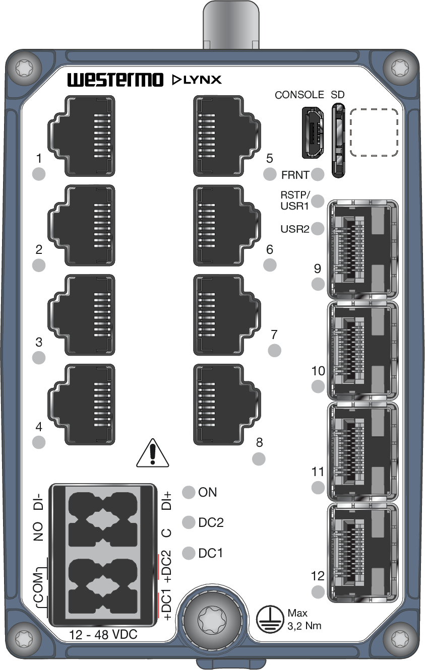 Westermo Industrial Gigabit Switch Lynx 5512 front left view.