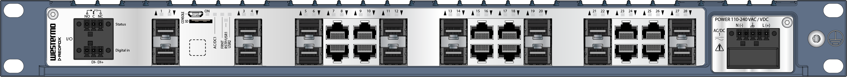 19" Managed Substation Automation Switch - High voltage version, layer 3110 to 240 V AC/DC16 x 100/1000 Mbit/s SFP transceivers supported, Ethernet FX (LC)12 x 10/100/1000 Mbit/s, Ethernet TX, RJ-45