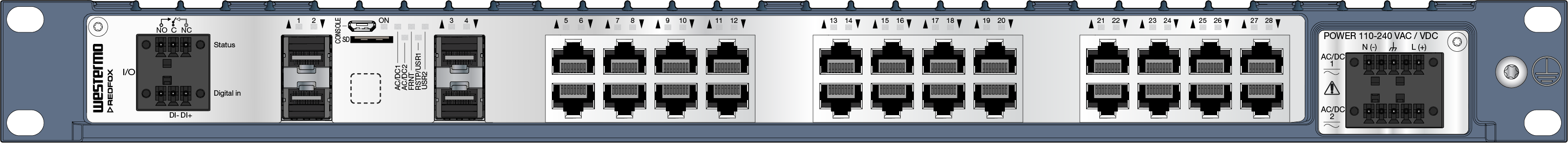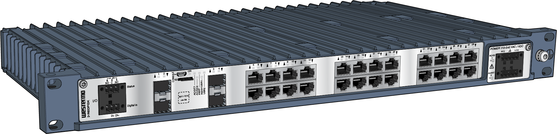 19" Managed Substation Automation Switch - Dual high voltage version, layer 3110 to 240 V AC/DC4 x 100/1000 Mbit/s SFP transceivers supported, Ethernet FX (LC)24 x 10/100/1000 Mbit/s, Ethernet TX, RJ-45