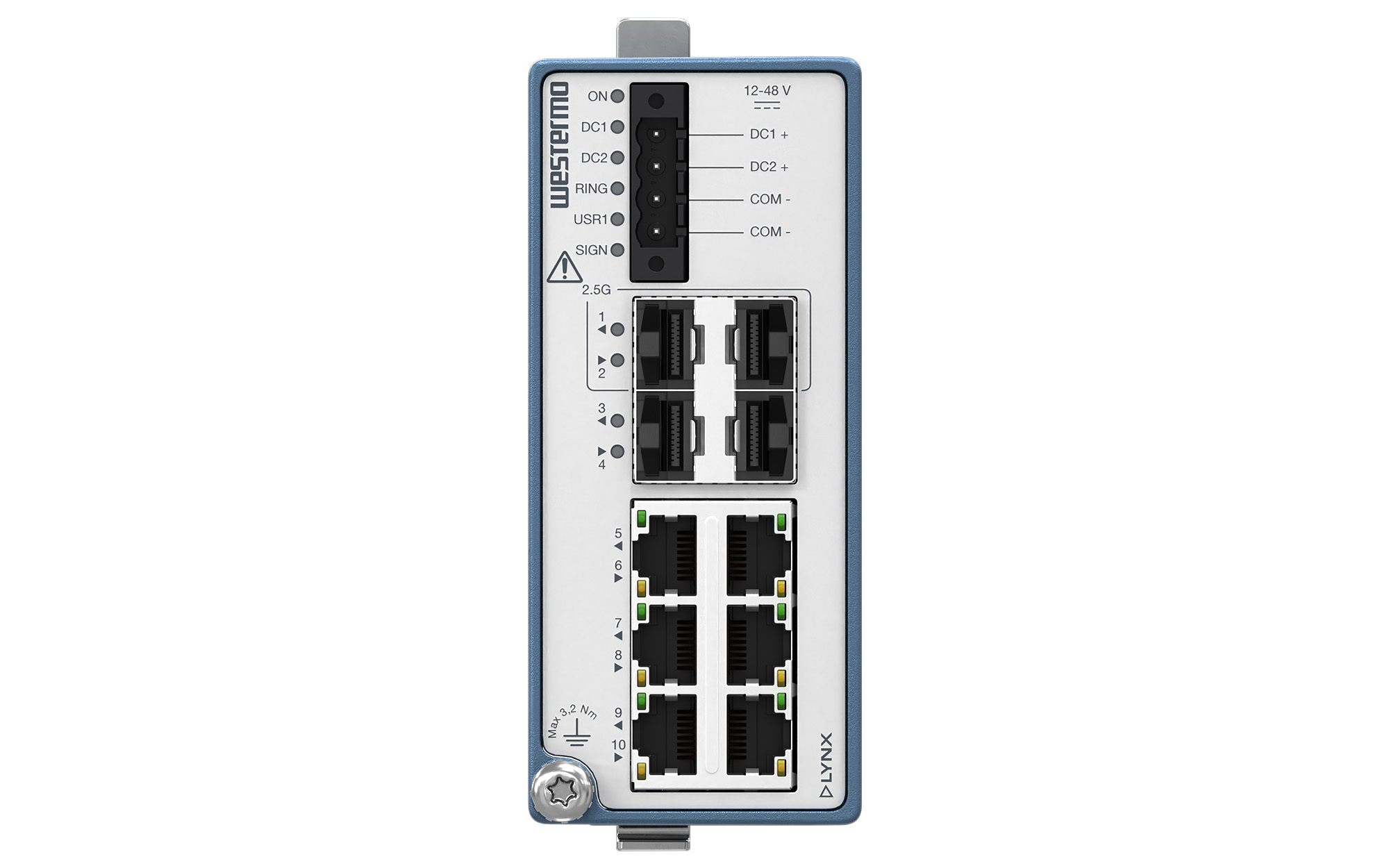 Industrial Layer 3 Gigabit Switch6 x RJ-45, 10/100/1000BaseT(X)2 x 2.5 Gbit/s + 2 x 1 Gbit/s SFP Fiber ports12 to 48 VDC-40 to +70°C